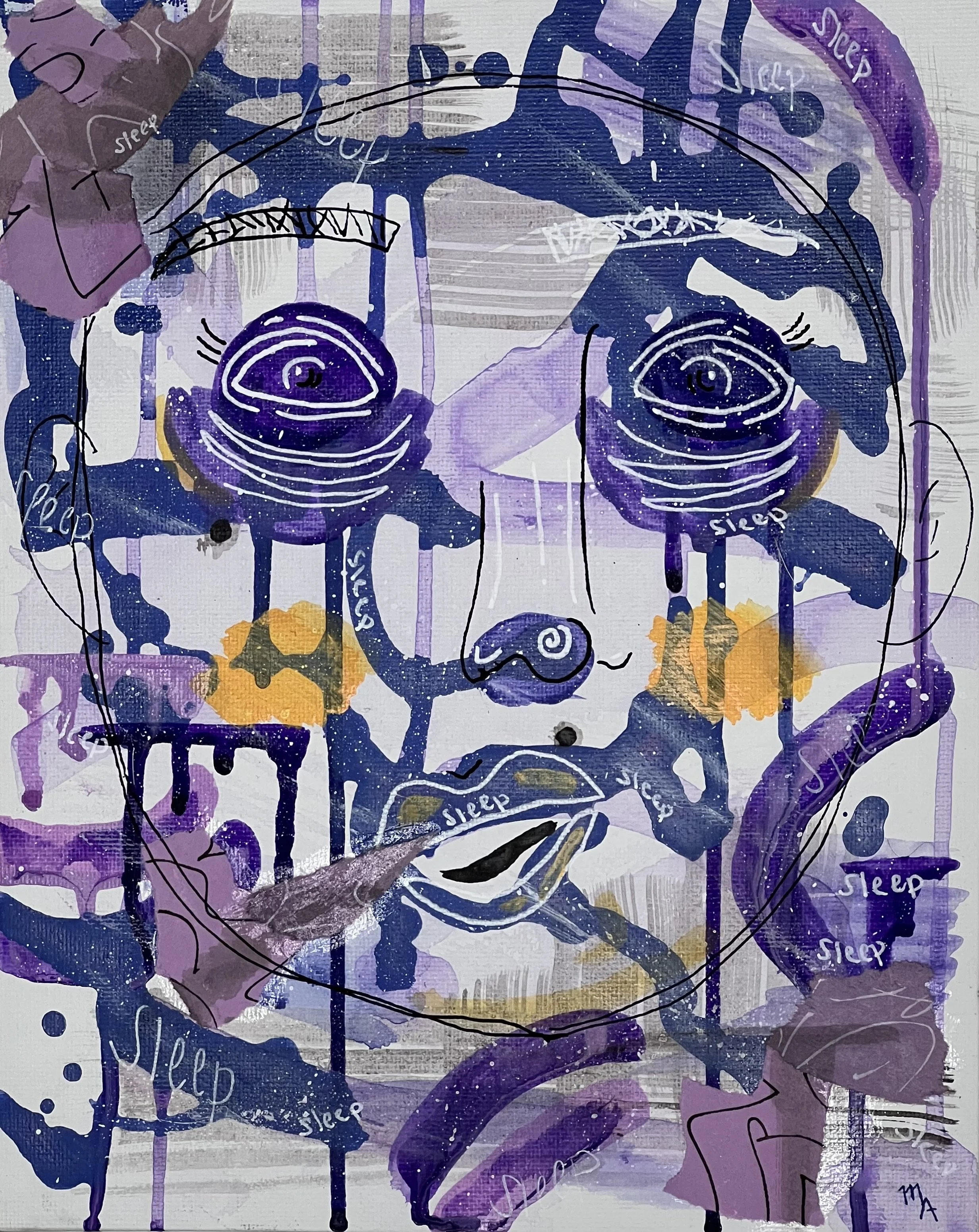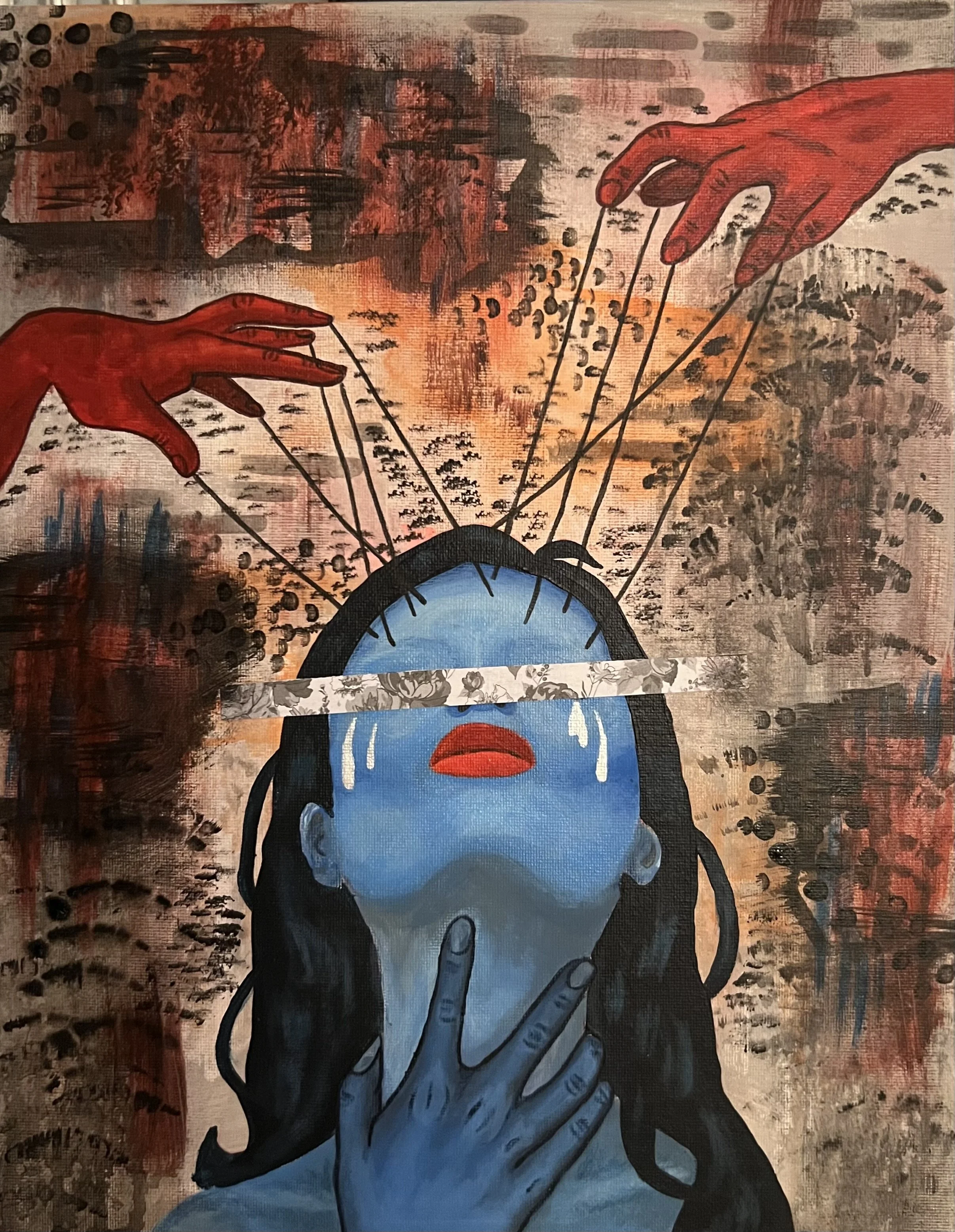 M. works primarily in acrylics, exploring abstract forms to capture the emotions and nuances of human experience. Her work often features faces and hands, reflecting her interest in human behavior, expression, and connection.