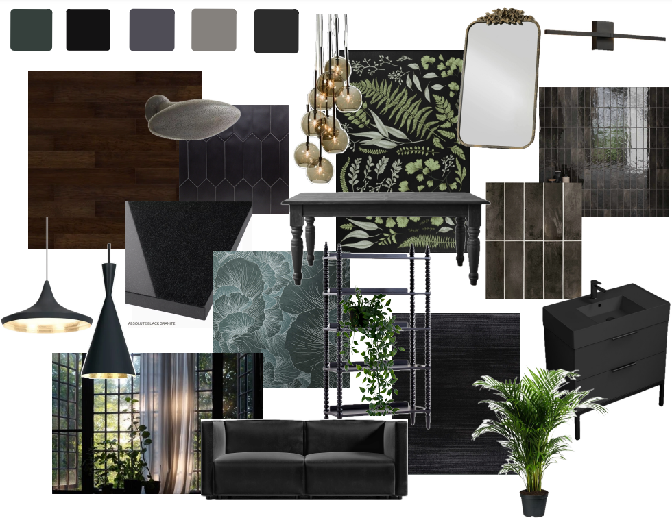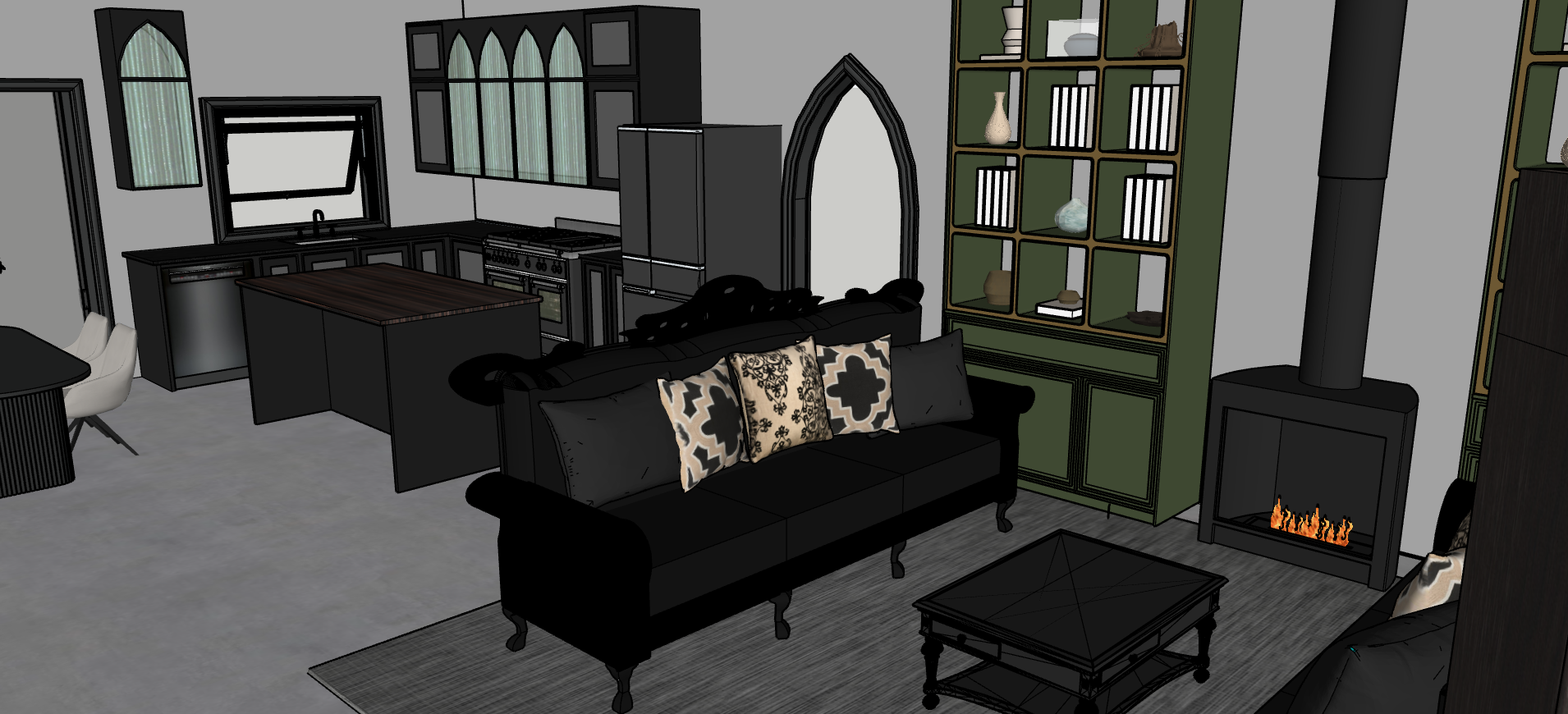 The design highlights the couple’s bold and distinctive aesthetic, blending Victorian-inspired gothic farmhouse elements with subtle modern influences. Through intentional spatial planning and curated fixture selections, the project balances drama and ornamentation with contemporary functionality, creating a richly layered yet livable environment.